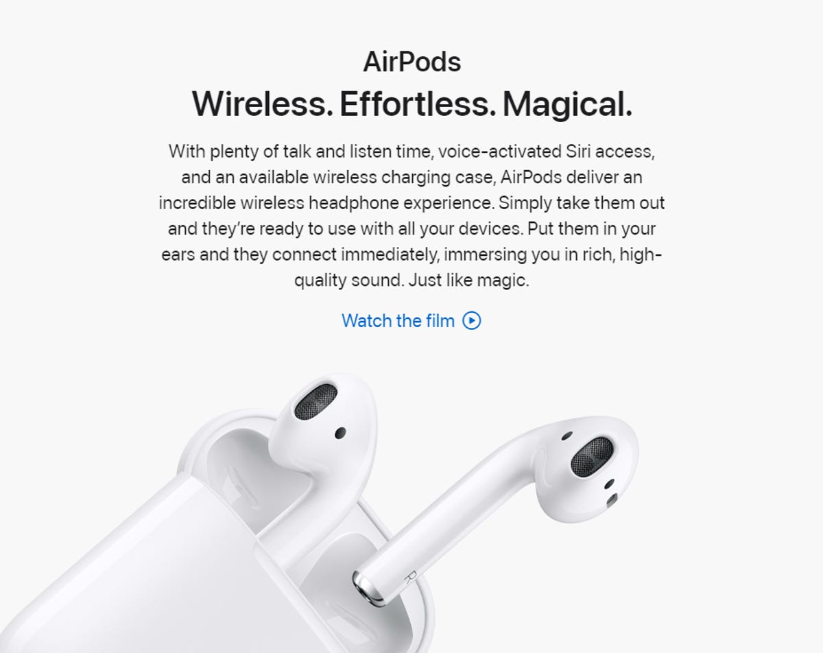 1) See how it grabs my attention with the headline: Airpods - Wireless. Effortless. Magical. The three words by themselves caught my attention and when put together, makes it a bold and interesting statement that evokes curiosity.