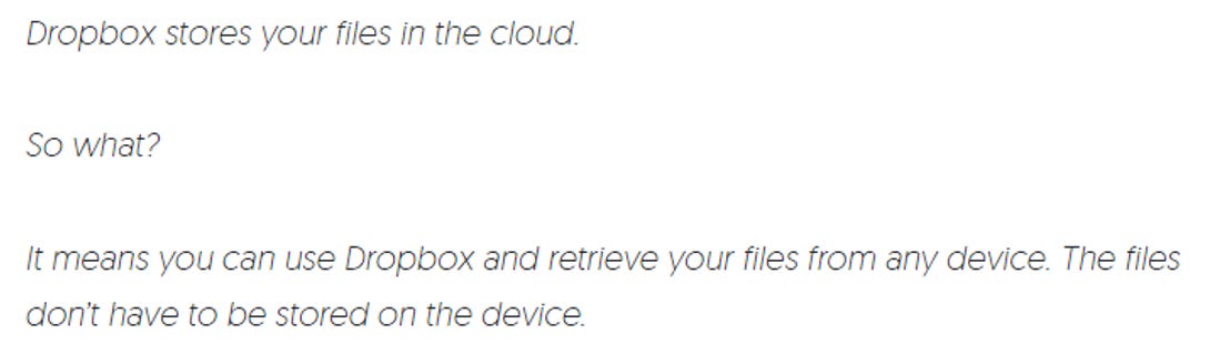 Ask yourself 'so what' every time you write something. Why? People care about the benefits and value your product can provide, and not about what features it has.