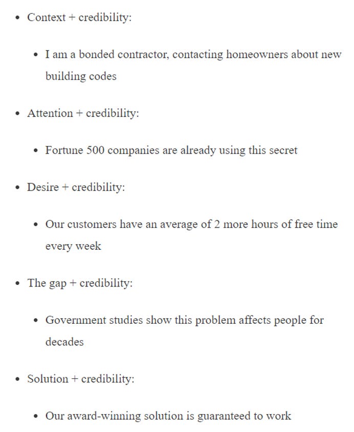 +1. Credibility: Credibility should be established along the way and not as a 7th step. Essentially, context should be paired with credibility, attention should be paired with credibility, desire should be paired with credibility, and so on.