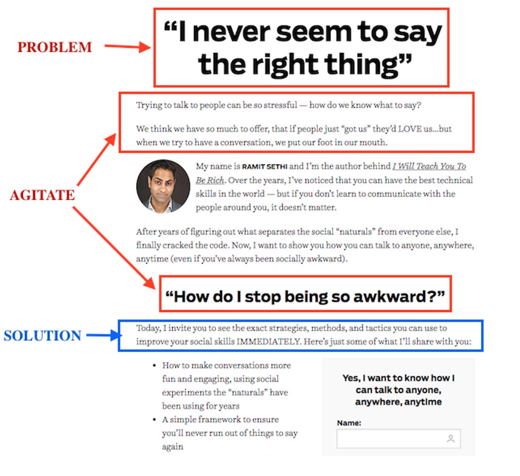 Agitate: Agitate it by tapping into something your customer is angry or resentful about (How can I exaggerate the problem and make it seem worse by using emotion?)