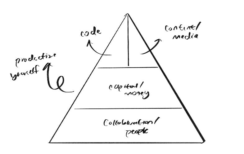 Likewise for content, or media leverage, it is the idea of products with no marginal cost of replication and a form of permissionless leverage. It's positioned at the same level with code.